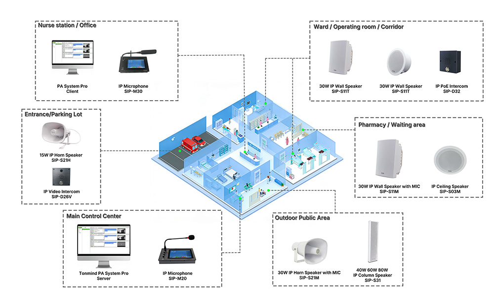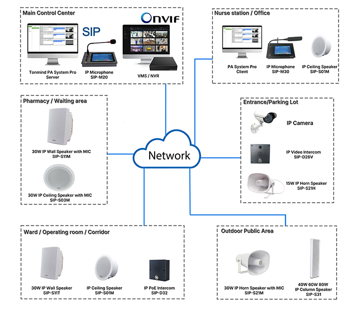 The TONMIND IP Speaker & PA System brings together modern network audio, SIP public address, and ONVIF-based security integration to meet the demanding requirements of healthcare facilities.