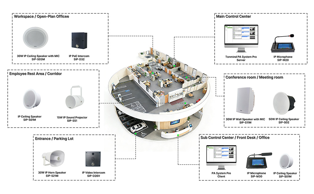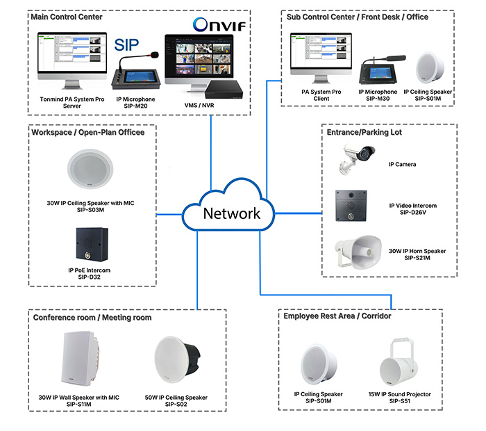 The TONMIND Enterprise Public Address Solution delivers a comprehensive approach to modern corporate public address and safety. By integrating IP Speaker technology, intelligent PA System control, SIP interoperability, and ONVIF-based security linkage, enterprises gain a powerful, flexible, and reliable platform that supports daily operations while protecting people and assets.